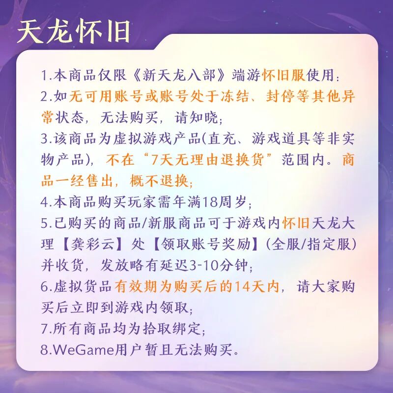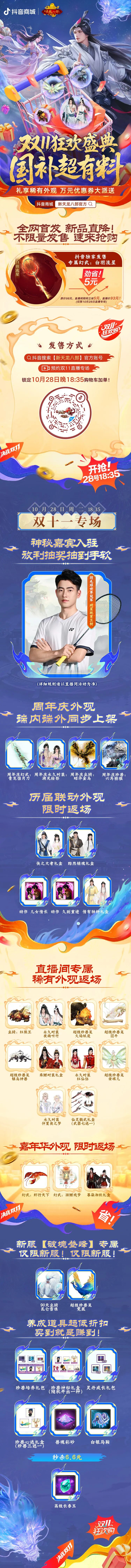 发表时间:2025-10-27 作者:叶子猪小秘书 编辑:月光下完美 来源:网络|   少侠们好呀,前两日八妹带大家走进了「明星玩家团」成员的天龙江湖。  其中八妹还提前和大家预告了羽毛球冠军王昶带来的江湖惊喜:明星玩家球拍同款的专属定制幻武!  锁定10月28日18:35,抖音“新天龙八部端游”官方直播间,天龙双十一国补专场,独家幻武、稀 少侠们好呀,前两日八妹带大家走进了「明星玩家团」成员的天龙江湖。 其中八妹还提前和大家预告了羽毛球冠军王昶带来的江湖惊喜:明星玩家球拍同款的专属定制幻武! 锁定10月28日18:35,抖音“新天龙八部端游”官方直播间,天龙双十一国补专场,独家幻武、稀有外观返场、折扣养成好礼等你! 天龙双十一国补专场 开启时间 10月28日 18:35 直播地点 抖音“新天龙八部端游”官方直播间 海量直播惊喜 明星玩家同款专属幻武,不限量限时首发。 历届联动外观、直播间专属稀有外观限时返场。 抽奖抽到手软,超级珍兽笼:狭路逢、坐骑:云霄羽翼、海量周边抱回家! 新服专属时装、坐骑;超低折扣养成好礼等你来抢! 明星玩家同款定制幻武 前两天八妹已经和少侠们预告了天龙端游18周年特别定制的幻武「白羽流星」! 幻武在设计上以“明星玩家团”成员、羽毛球世界冠军王昶常用羽毛球拍为原型,沉稳外观下藏着十足爆发力,拍身萦绕的火焰动效,既呼应他赛场上的昂扬斗志,也代表了明星玩家和天龙之间的18年江湖炙热情谊。 既然是冠军同款羽毛球拍,怎么能没有帅气的击球扣球动作呢! 在游戏内施展专属幻武动作时,角色将进行一系列轻盈流畅的颠球动作,最后以一记强劲击球,将羽毛球如流星般击出,在空中留下绚丽的火光轨迹,将王昶灵巧飘逸的球风与锋芒毕露的个性巧妙结合,呈现了他在赛场上的竞技精神与个人魅力。 未来,希望少侠们也能手持“白羽流星”,在属于自己的江湖赛场上,打出那制胜一击! 10月28日,来抖音直播间get明星玩家同款幻武「白羽流星」!更有直播惊喜价格! 神秘嘉宾空降现场 羽毛球世界冠军、巴黎奥运会男子双打亚军——王昶大侠还将惊喜做客直播间,与各位少侠游戏互动! 关于更多互动环节及福利爆料,容八妹先跟大家保个密,各位可以期待下后续的精彩资讯! 更多直播详情前瞻↓ 为了让少侠们能够更丝滑的选购到自己心仪的货品,八妹准备好了详细【购买须知】,少侠们务必仔细阅读! |