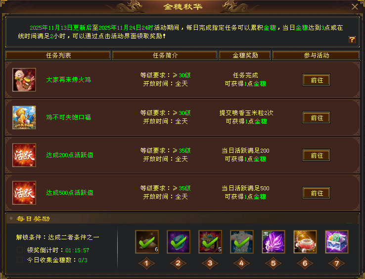 『感恩节』活动限时回归 最近走在洛阳的大街上 八妹总能闻到一股烤火鸡的香气呢 算算日子一年一度的感恩节活动 又到了即将开启的时候 各位少侠快来跟八妹一起看看 这次又有哪些好玩有趣的活动吧(`3′) 秋日签到大作战 本周更新后,各位少侠即可在游戏内主界面开启“金穗秋华”活动。 只需简单完成每日在线、每日活动任务或达成一定活跃值要求,即可累计当日积分,激活奖励! 包含垂藤纹艺匣、九尾魂玉、6阶自选固灵仙露、高级长春玉、限时帅气外观坐骑等在内的超多奖励等待大家抱走! 别放过那只火鸡 感恩节限定玩法“烤火鸡”回归!各位大宋厨神速速上线啦ξ( ?>??) 活动期间大侠可使用“浓情炭火”、“幸福火鸡”、“暖暖烤盘”进行火鸡烤制。 参与活动不仅可获得坐骑:鸵鸟(限时)、虹耀石、淬魂液、白银马鞍等元宝道具好礼,更可在“火鸡烤制”期间,持续获得最多18次的丰厚经验奖励! 喂养火鸡拿神兽魂玉 在系列活动持续期间,各位大侠还可在每日通关指定副本后,收集到“肥肥玉米饼”、“啾啾玉米粥”。 使用道具完成每日喂养任务,即可获得千淬神玉、绘金尘、高级长春玉等超多道具奖励! 累计完成每日喂养,还能解锁超级珍兽还童天书、九尾魂玉等豪华大礼! |