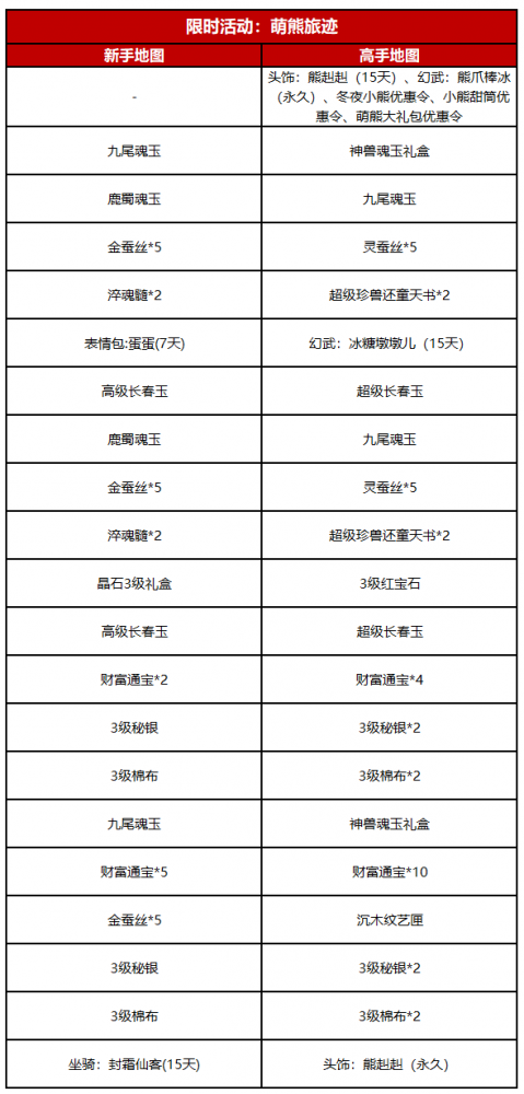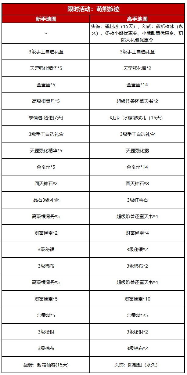 全新『冰雪燃动季』明日上线!诸位大侠准备好迎接本次的冰雪狂欢了嘛 前方到站:冰雪不夜城 是动起来的新衣服 明天更新后,本期冰雪节的“冬日萌熊”主题系列外观,就要与各位大侠正式见面啦(`3′) 这些奖励别放过 在本次即将开启的全新冰雪限时活动【萌熊旅迹】中,还有着不少可以美美“白嫖”的惊喜奖励! 各位少侠只需每日参与冰雪节相关玩法,或完成老三环、燕子坞、杀星等副本,均可获得一定旅迹点数,累计后即可在“新手地图”中,免费领取3级秘银棉布、九尾魂玉、3级晶石礼盒、大量金蚕丝、冬日坐骑:封霜仙客等超多豪华大礼! 更多奖励八妹都整理在下面啦,各位少侠可以滑动查看~ 关于原始服专区的奖励,大侠往下看↓ 少侠少侠!解锁高手地图获得的相关优惠令可别忘记使用,获得对应优惠令后入手全新外观,可以省下不少元宝呢(`3′) |