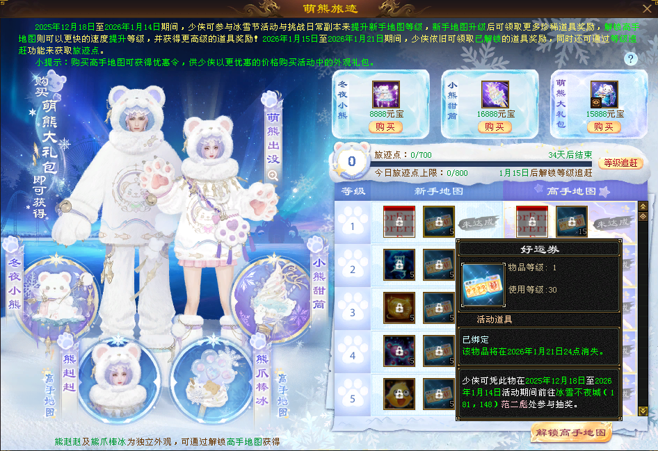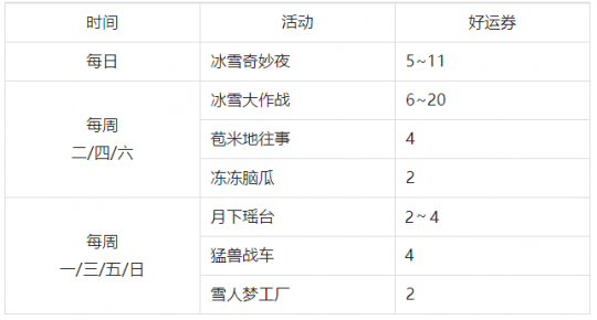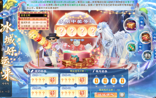 各位少侠,冰雪节新增的“冰城好运来”活动已经上线,大量招财通宝、限时稀有幻武:冰糖墩墩儿、人气坐骑:流霜灵驹超多奖励等你一发入魂! 为了帮助各位更好参与活动,八妹特意邀请记者站的“瓶子”大侠整理了一份好运攻略,少侠们还不快快行动(`3′) 本文记者:「听香水榭」瓶子 注:投稿有关内容仅玩家作者个人观点,不代表官方,最终上线内容以正式服为准。 这几个时间别忘记 活动时间 12月18日至次年1月14日24时 时间节点 选号阶段:00:30-22:00 摇奖阶段:22:00-22:04 (每1分钟开一组号,一共4组) 公示阶段:22:05-00:30 (重要:奖品保留24h及时领取) 号码选取 少侠只要攒够足量好运券,就可以动身前往范二彪处选择你的幸运数字,参与每日4次的抽奖。 各位可以尝试自己的生日、幸运数字、或者各种玄学方法,如果有选择困难症,也可以直接点随机生成一组提交。 好运券获取 好运券获取方式很简单,冰雪城的每日活动以及萌熊旅迹都可以获取。 途径一:萌熊旅迹 “新手地图”中每升一级可获取5张好运券,解锁“高手地图”的话首次可以直接获取共20张好运券,后续每升一级10张。 解锁“高手地图”,可直接获取熊爪冰棒幻武以及升级获取萌熊头饰,除此之外还有很多养成道具和大量交子,性价比高,有需求的小伙伴可考虑直接解锁“高级地图”。 途径二:冰雪城活动获取 每天参与冰雪城的限定活动可以获取大量好运券,也是好运券的主要来源,很多活动甚至不需要组队就能获取,对不喜欢组队的玩家十分友好! 这里给大家总结了冰雪城活动好运券的获取时间和数量: [冰城奇妙夜]活动为12月25日后开启,每日可获得5~11张券。 另外需要注意的是答题和冰老虎活动为限时活动,记得注意时间不要错过啦。 冰雪城活动每日全做的话每周保底数量为36+32=68张,加上地图保底给的券,每周可至少参与7次抽奖。不需要肝,对于PVP活动大家可根据时间自己安排。 关于奖励 根据中奖号码来定奖励等级,第一名不仅可以拿到100交子,还可以自选一件限时外观,搏一搏,单车变摩托! 不过抽奖也有交子保底奖励,所以有好运券就直接冲即可。 PS:开奖后一定要记得在24h內领取,不然会过期的! |