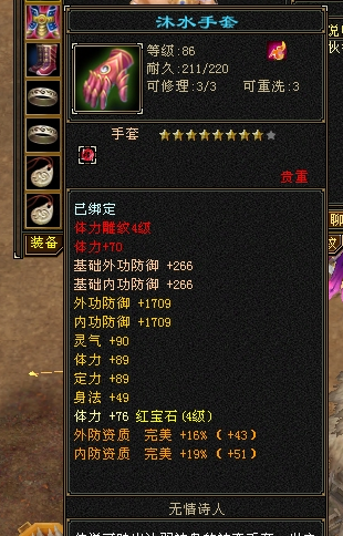 卡级神装的追求 粗略盘点一下不难发现,卡级玩家群体中80组人数最多,实力也最为强劲,这也造就了80级别手工频频出现神装的名场面。 单说防具,这几件极品和90级别大八星的差距并不大。 毕竟好装备自然不愁市场,而对于很多幸运值爆棚的少侠而言,绑定材料搓出来的极品,足以让他们成为这条街上最靓的仔! 细节词条往往更重要 不得不说,即便是80级别以下的卡级大佬们,对于装备细节的要求依然不打折扣。 例如这件66级8星手套,气武当选手心动吗? 回想起2020年怀旧一区太湖仙岛开区不久的时候,这件75级极品护符还成为很多逍遥大神争夺的对象。 可遇而不可求的热门 将视线移回全服,纵观各个大区,攻击装备中的极品戒指和护符,每每都能高价成交。 词条足够惊艳的极品手工根本不愁市场,受到了很多满级玩家的青睐。 而那些对应特定门派流派的神装,如气武当专属、四属性饰品等,更是可遇而不可求。 在等级限制的框架内,手工达人们挖掘出突破极限的可能,让装备不再是简单的数值堆砌,更是智慧与毅力的双重博弈,致敬神级卡级装,也祝各位屏幕前的小伙伴都能收获自己的专属神装! |