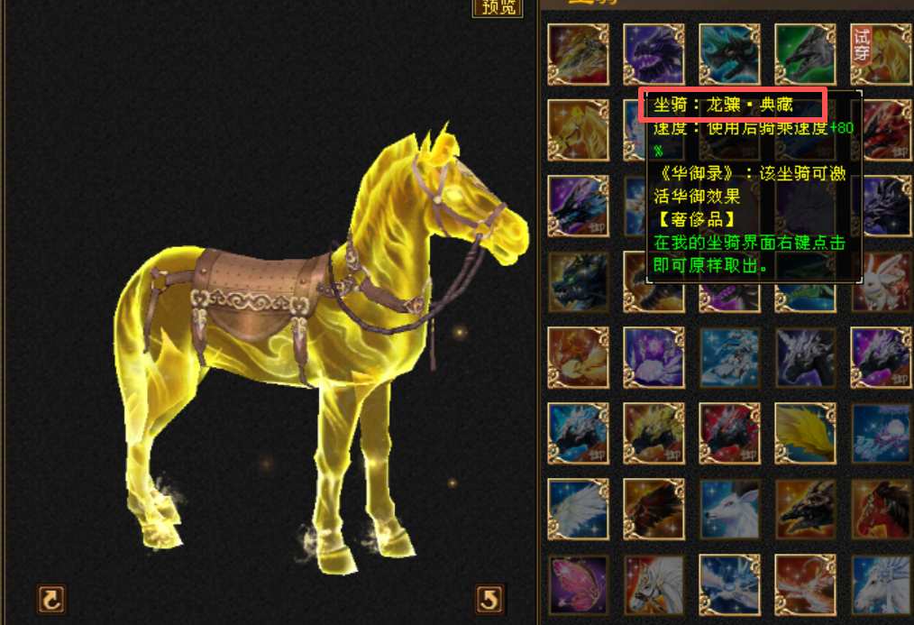 不能骑的马也很厉害 駮bó马 提起“交马”,各位少侠肯定不会陌生(`3′) 不论是总感觉有一股“又土又萌”气息的珍兽宝宝,还是拥有一头炫酷火焰长发的变异珍兽,相信都曾陪伴不少人走过这漫漫江湖路。 七彩辉骏 比起“痛失真名”的駮马,作为后辈的七彩辉骏绝对算是人气爆棚。 尤其是它酷似独角兽的外形,可以说从一变到顶变,每一档都长在了各位少侠的审美上,真?无废变! 马形坐骑大盘点 天龙派专属坐骑 既然开始盘点马形的坐骑,那必然绕不开各位都熟悉的【天龙门派】。 从黄骠马一路过渡到青白骢马、龙血马,是多少大侠的青春记忆(′?ω?`) 白马系列 寒星灵驹、赤影、流霜灵驹、绝地...... “银鞍照白马,飒沓如流星”是最直白的写照,颜值自带“清冷仙气”,能很好的衬托出江湖儿女的风骨。 天乌骓系列 天乌骓系列的破浪、泣血、流光 ,绝对都自带 “王者气场”! 奔跑时蹄下星尘飘洒,双翼展开时更显璀璨华彩,既有“飒沓如流星” 的迅捷,又有“怒鸣一啸震天” 的磅礴气势。 烈炎乌照 坐骑整体以红色为主色调,马身装饰有金色的纹路和火焰特效,仿佛周身燃烧着烈火,充满了力量。 赤兔 人中吕布,马中赤兔,驰骋江湖,自当快意恩仇! 战马系列 不论是身着赤金宝甲的江南锁甲马,亦或是身布紫色尖刺的大漠金戈马,都是陪伴各位征战沙场的绝佳之选~ 那些“不太一样”的马 天马系列 白天马与黑天马,绝对也是不少大侠心中的白月光。 不知道承载了多少玩家曾经年轻时,“轻剑快马闯江湖” 的浪漫情怀。 梦灵仙驹 龙驹踏雾出尘寰,皎皎仙姿落玉盘。 这匹以 “梦” 为名、以 “灵” 为韵的坐骑,配合上独角兽的外形、皎白身姿,可以说从诞生起就自带热度。 蹑景系列 蹑景、蹑景·典藏、龙骧 、龙骧·典藏 这几匹坐骑均为秦风设计。 仿佛是一匹封印千年后重获新生的灵魂骏马,周身散发着淡淡的荧光,蕴含着神秘的力量。 马车系列 只需稍稍四舍五入,“木马”也是马σ ?? ?) ???)σ 六合舆、旋转木马、马车、木牛流马这些坐骑,又是否能拉起各位少侠的回忆? |