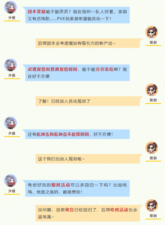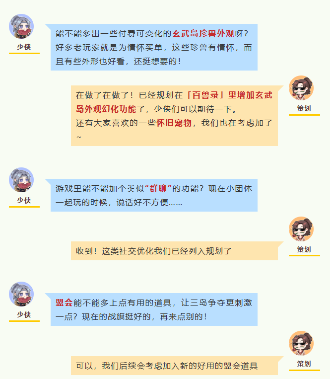 少侠们周五好呀!今天又到了八妹的「倾听江湖」栏目啦~ 苏州见面会上,八妹收集到了很多少侠们的建议,小本本都记得满满当当啦!在大家的热情提议下,很多问题已经有了新的进展,今天八妹就特意邀请了策划大大,来给大家一一解答一下~ |